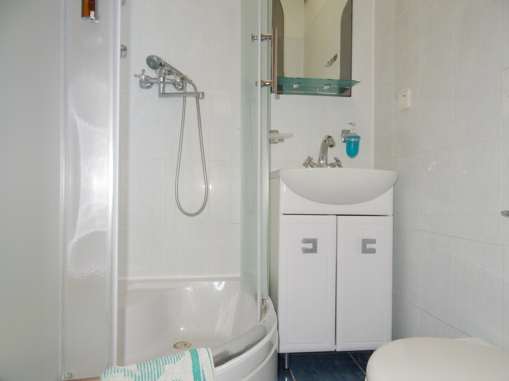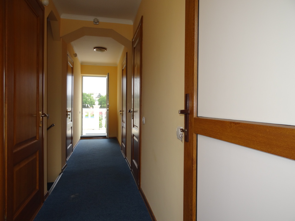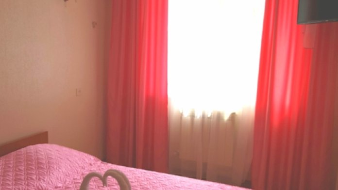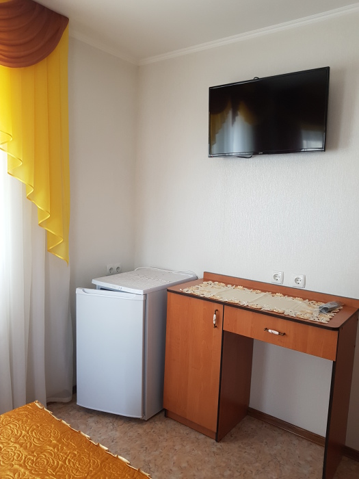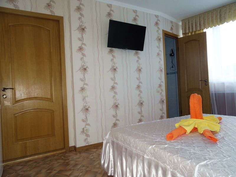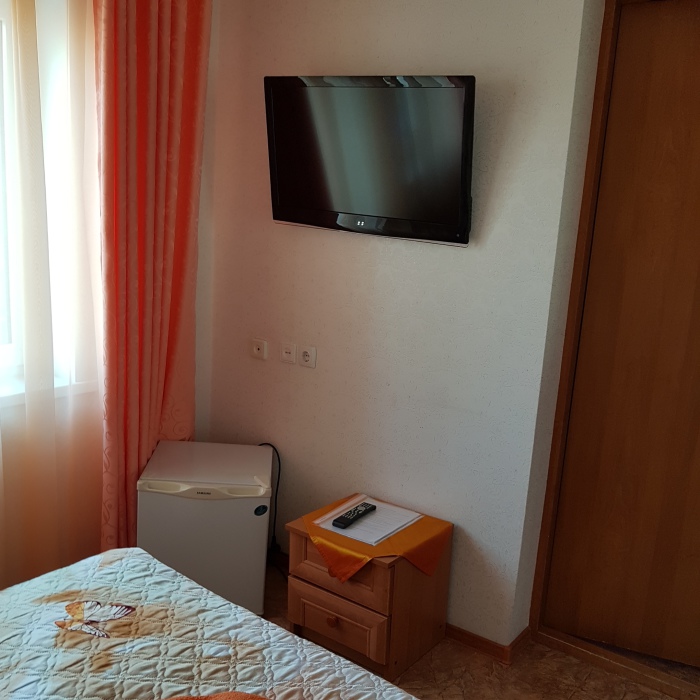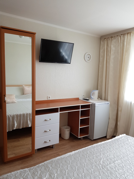 Комфорт 2-местный белая комната, третий этаж, балкон. Номер оснащён: кровать семейная 180 см, (для доп. места - раскладная кровать) плательный шкаф, тумбочки прикроватные, комод, зеркало, кондиционер, холодильник, телевизор с плоским экраном и кабельными каналами, интернет, пастельное бельё, комплект полотенец, фен, электрический чайник. Туалетная и душевая кабина в номере (туалетные принадлежности личной гигиены прилагаются). Выдаются пляжные принадлежности.