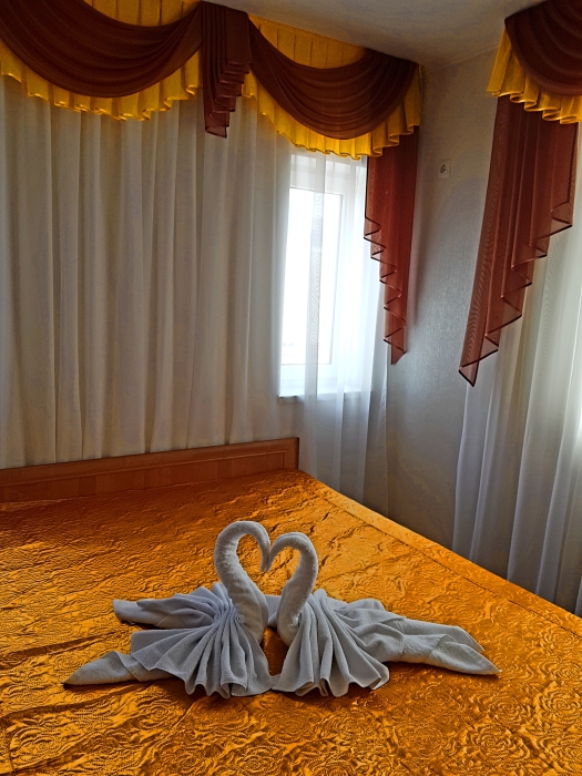 Комфорт 2-местный золотая комната, третий этаж, балкон. Номер оснащён: кровать семейная 160 см, или две одноместные 80 см шириной, плательный шкаф, тумбочки прикроватные, комод, зеркало, кондиционер, холодильник, телевизор с плоским экраном и кабельными каналами, интернет, пастельное бельё, комплект полотенец, фен, электрический чайник. Туалетная и душевая кабина в номере (туалетные принадлежности личной гигиены прилагаются). Выдаются пляжные принадлежности.