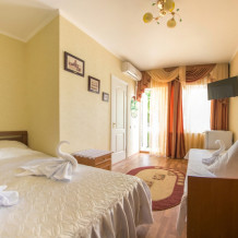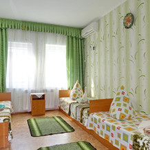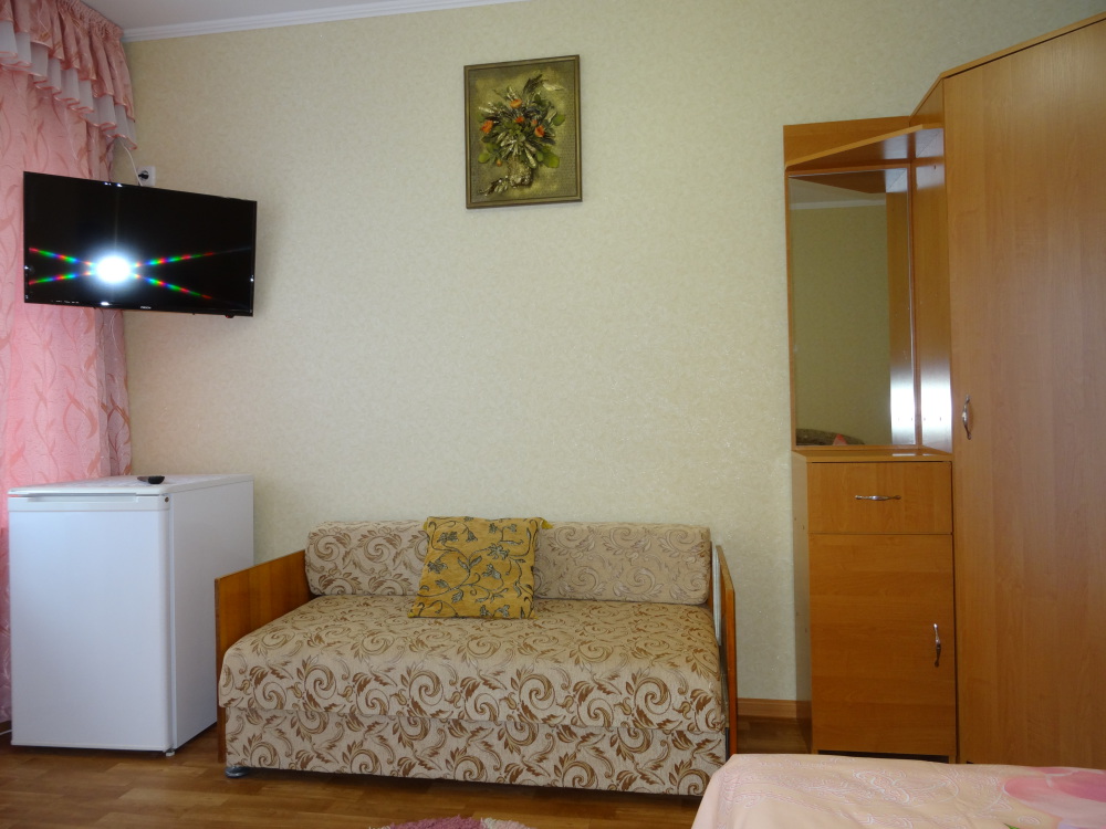 Номер Стандарт 3-местный - отдельный вход, балкон. Номер оснащён: кровать семейная 160 см шириной, раскладное кресло 80 см шириной, плательный шкаф, тумбочки прикроватные, комод, зеркало, кондиционер, холодильник, кабельное т\в, интернет, пастельное бельё, комплект полотенец, фен, электрический чайник. Туалетная и душевая кабина в номере. Выдаются пляжные принадлежности (коврик, полотенце). Гарантируется надёжность и охрана номера