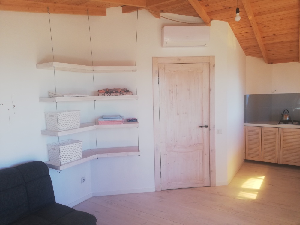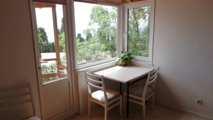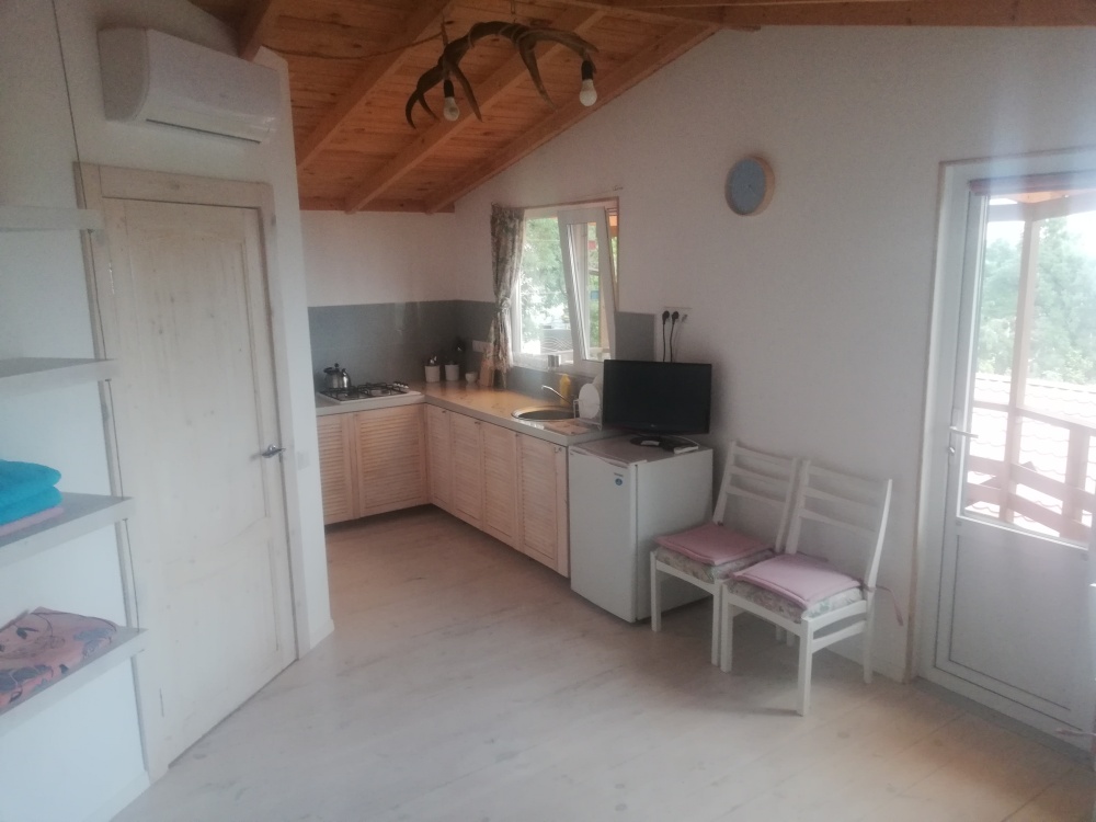В домике есть все необходимое: набор всей посуды, удобная большая кухня, газ плита, TV, кондиционер, wi fi, полотенца, постельное, утюг. Комнаты ОТДЕЛЬНЫЕ! В спальне двуспальная кровать, в комнате-студии двуспальный диван. Из всех окон панорама на море виноградники. Есть небольшой балкон с видом на море. Возле дома площадка с мангалом. Проход к домику отдельный, своя калитка на замке.