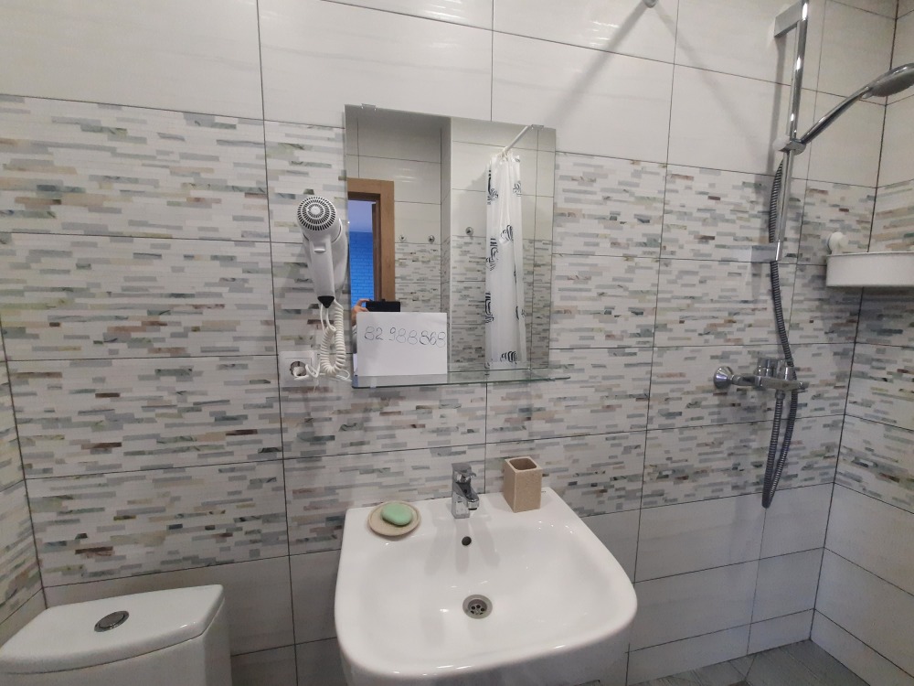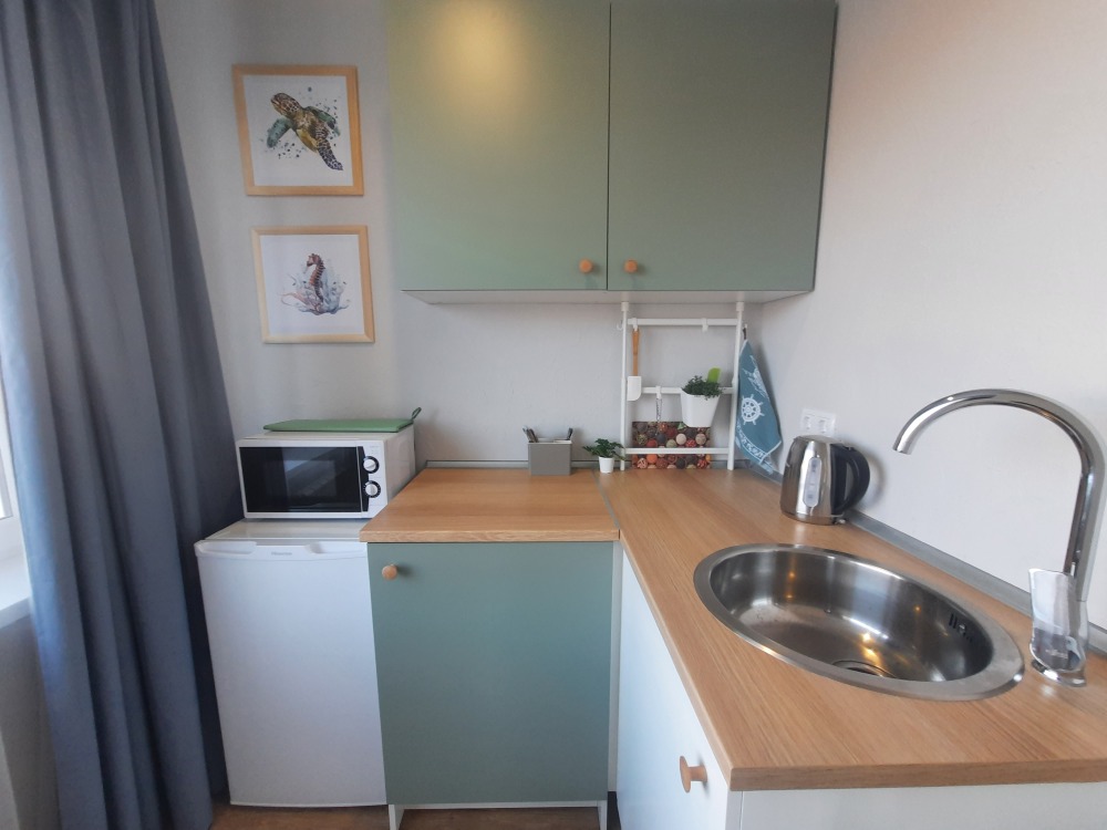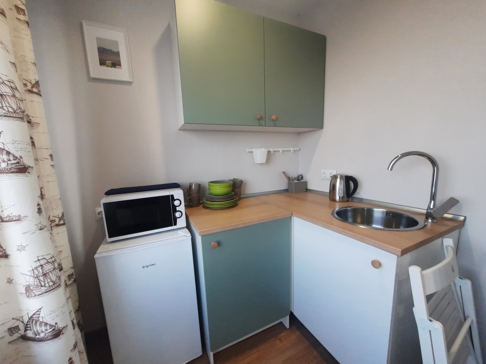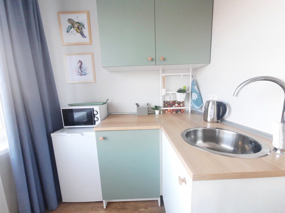 Мини-кухня оснащена холодильником, микроволновкой, чайником, мультиваркой, плита индукционная настольная ( по запросу), разнообразная посуда, бокалы и штопор! Санузел с отличным душем, полотенцесушитель, фен и т.д.