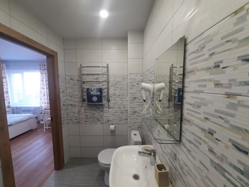 В апартаментах двуспальная кровать, раскладная диван -кушетка Икея «Хемнис» (раскладывается при необходимости в кровать 160*200), или двуярусная кровать (идеально для гостей с 2 детьми, только в номерах на 2 этажах), обеденная зона на 4 гостей, гардероб, комод, тумбочка и др. удобства в номере.