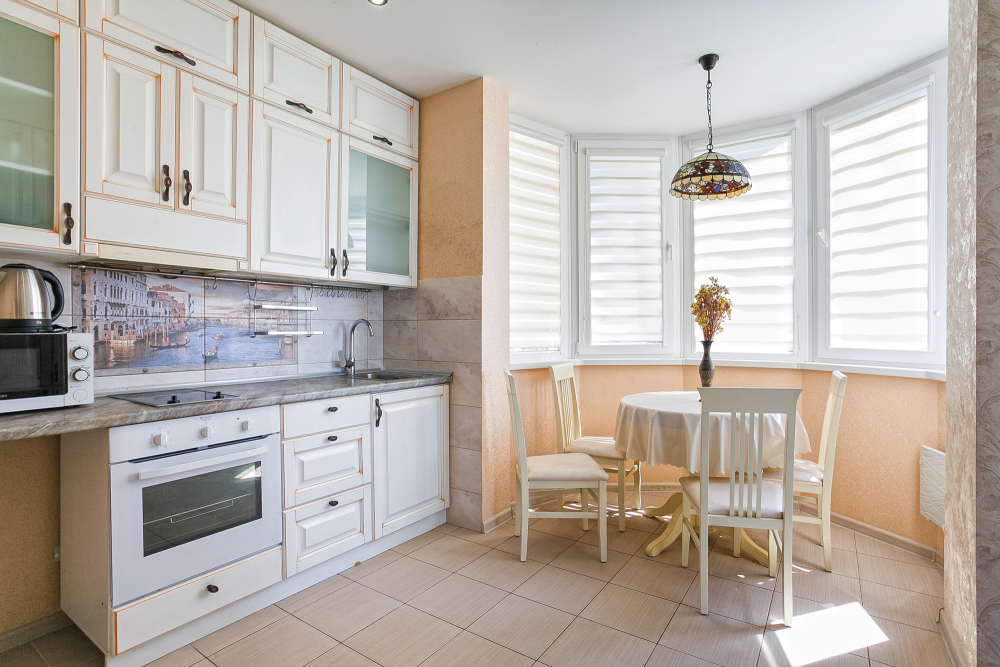 Квартира разделена на две зоны спальную и обеденную с зоной кухни.