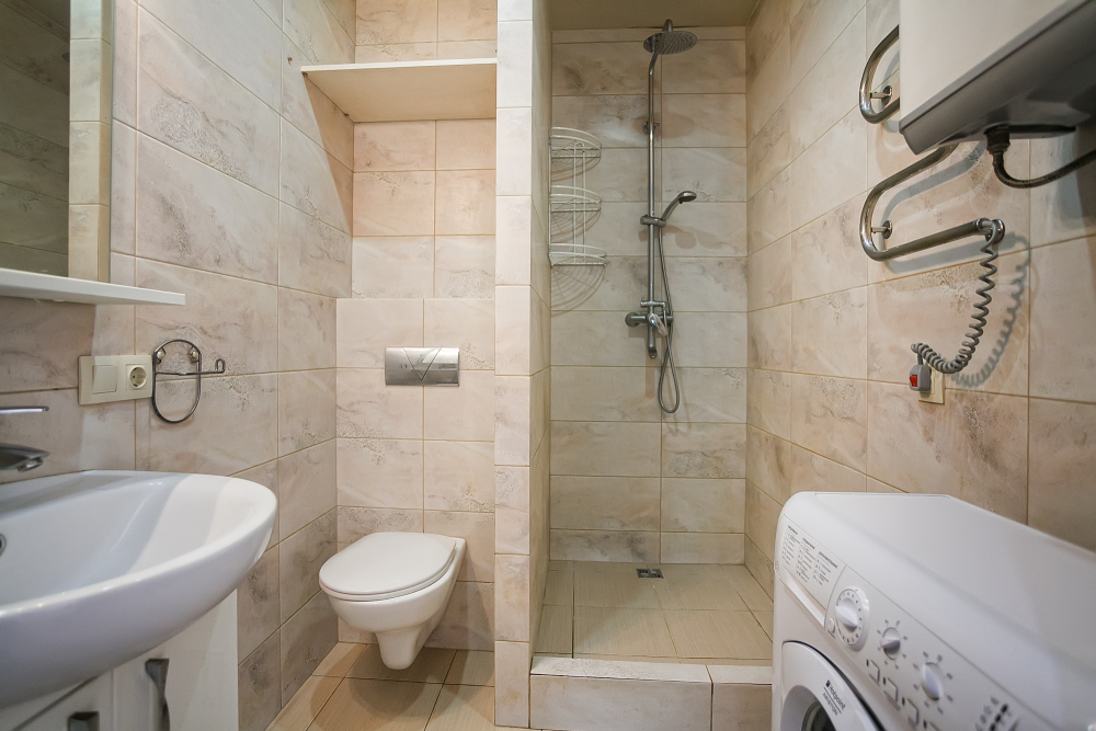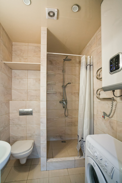 Санузел: душевая, унитаз, умывальник, бойлер, фен.