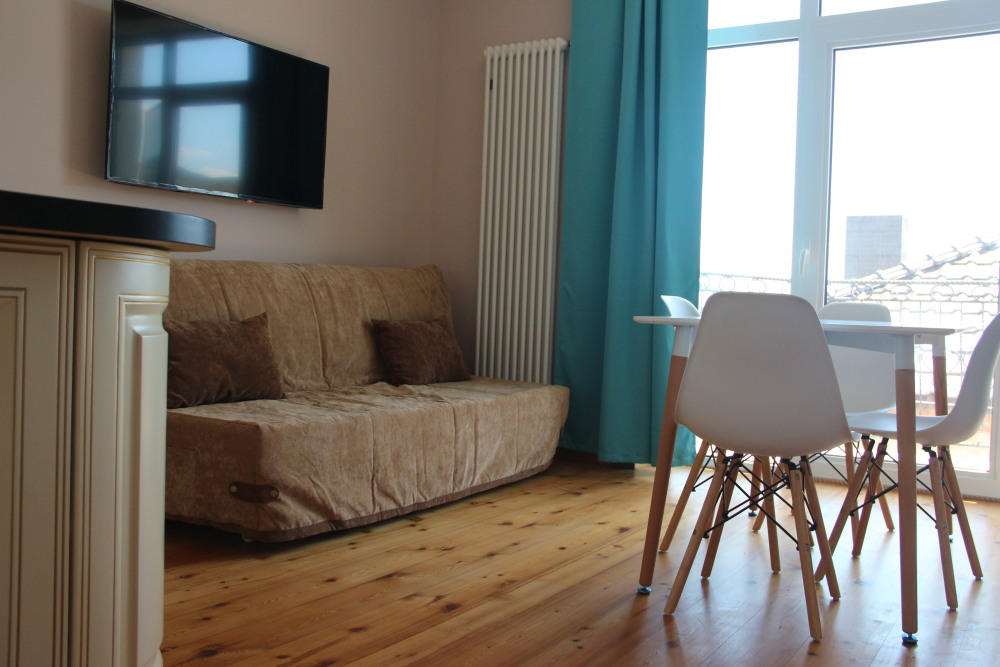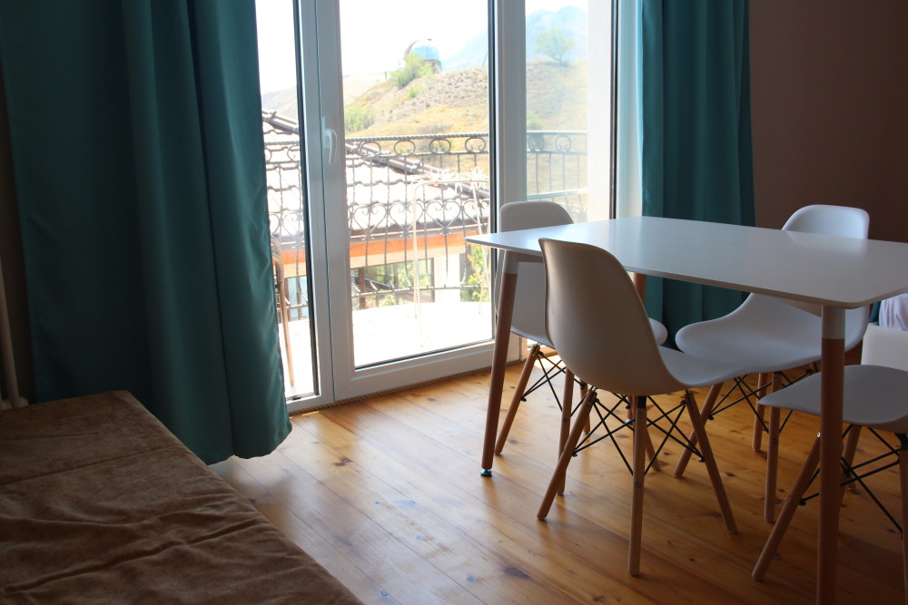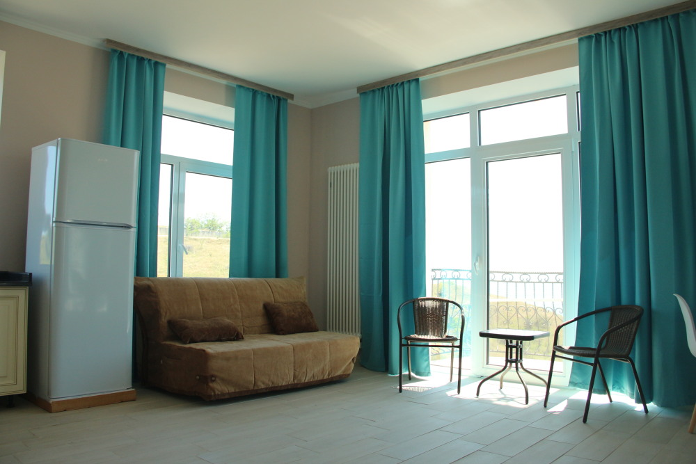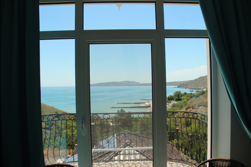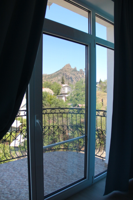 Огромный номер с видом на море и знаменитый Кара-Даг. Имеется ванная, полноценная кухня и отличная новая мебель. Постройка 2021 года, идеальное состояние. Море видно из всех окон и двух балконов.