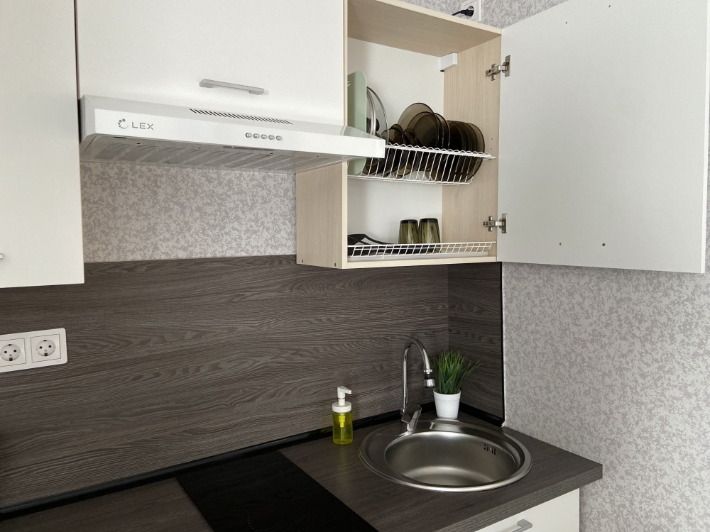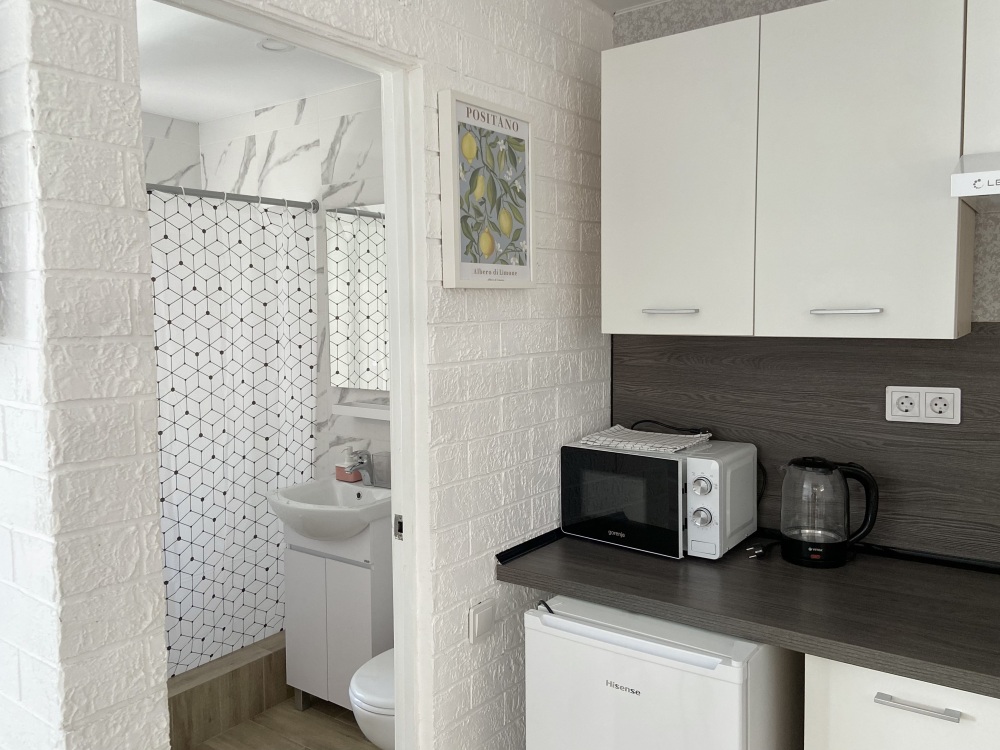 Студия рассчитана на проживание 2-х человек, но есть возможность установки доп. спального места (раскладушка) - 200 руб. сутки.