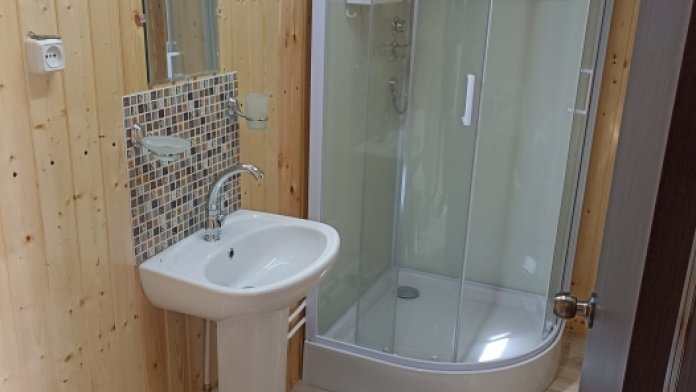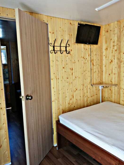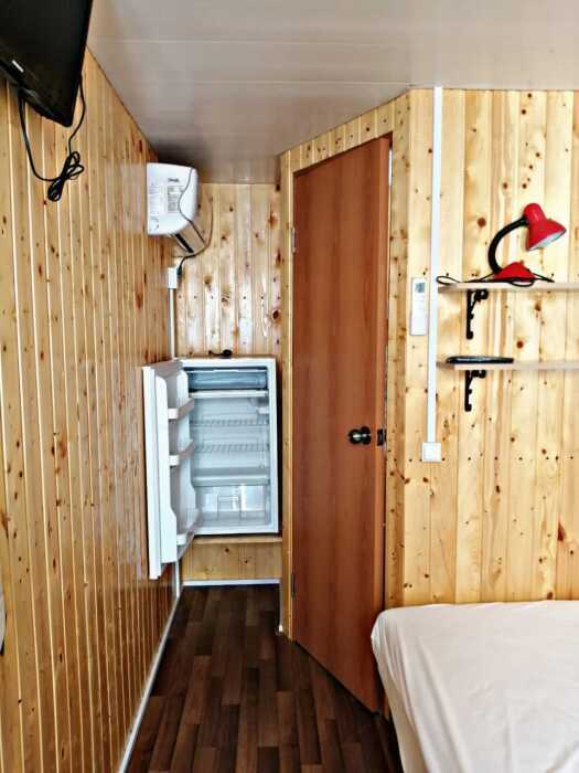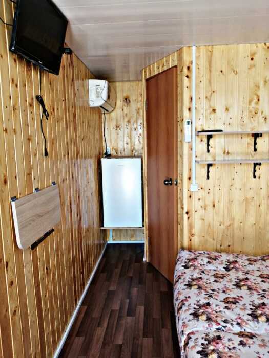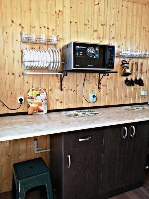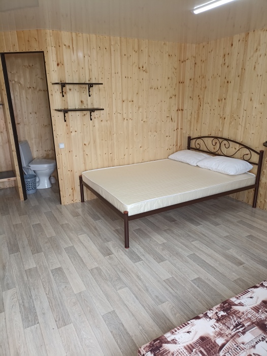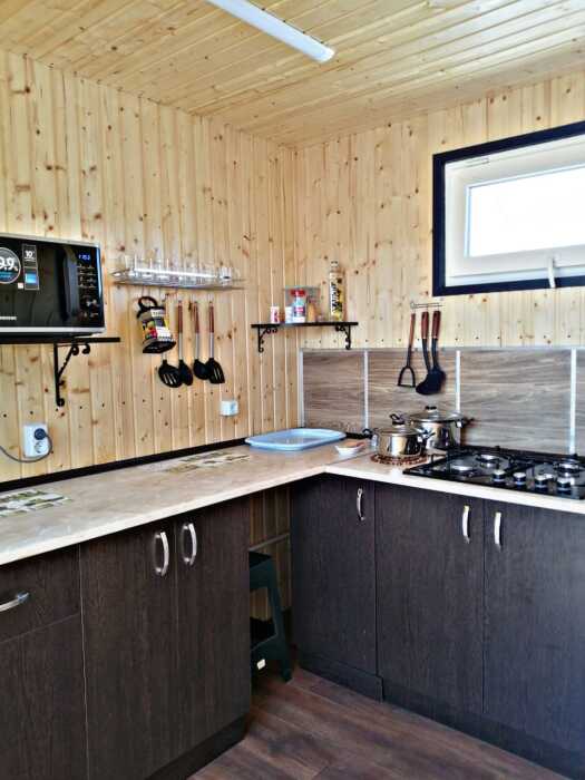 Новая кухня оборудована всем необходимым для самостоятельного приготовления. Небольшие домики, но оборудованы всем необходимым. Душ, туалет, умывальник, холодильник, телевизор, кондиционер, WI-FI. Новые домики свежей постройки 2021 года. Всё новое оборудование. Мангал на территории.