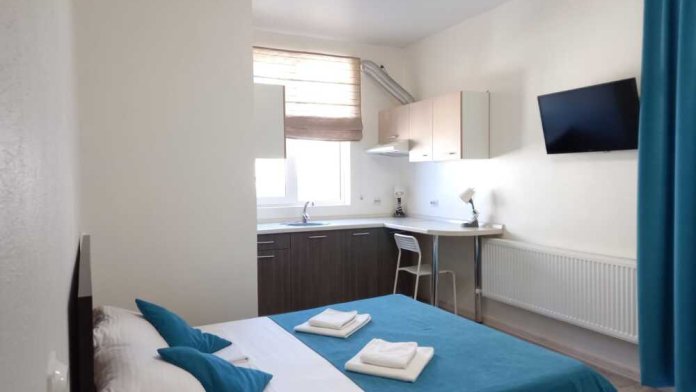 Двухкомнатные апартаменты рассчитаны на 2 основных места (две односпальные кровати) и 2 дополнительных места на диване, располагаются на 1 этаже отдельно стоящего корпуса. Общая площадь – 30 кв.м.