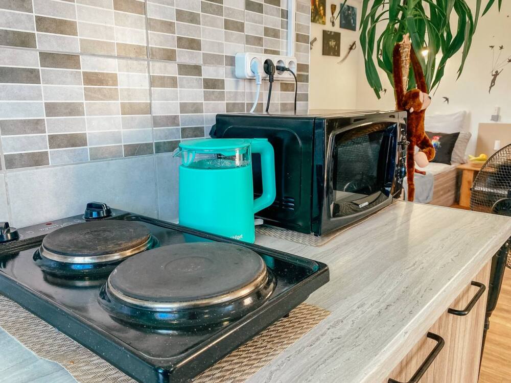 1. Всю необходимую бытовую технику (кондиционер, стиральную машину, холодильник, фен, плазменный телевизор, утюг, микроволновую печь, чайник)